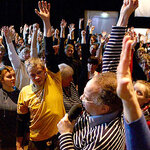 Am »B-Day – Mit Beuys arbeiten« führten wir in einem Gespräch gesellschaftlich aktive Gruppen zueinander, die mit dem künstlerischen Impuls, den Joseph Beuys eingebracht hat, arbeiten, nämlich dass Kreativität Kapital ist und wir alle Gestalter unserer Lebenswelt sind. Teilnehmer/innen waren Kurt Wilhelmi (Omnibus für Direkte Demokratie), Oliver Wiedmann (Mehr Demokratie e. V.), Kai Gregor (Free International University), Marianne Wagner (Freies Museum Berlin), Christiane ten Hoevel (Eranosdialog), Shelley Sacks (Social Sculpture Research Unit), Hildegart Kurt (und. Institut für Kunst, Kultur und Zukunftsfähigkeit e.V.), u. a. Anschließend fand die Kunstaktion »Superconstellation« von Stefan Krüskemper und Kerstin Polzin mit der Frage »An welcher Grenze arbeitest Du?« statt.