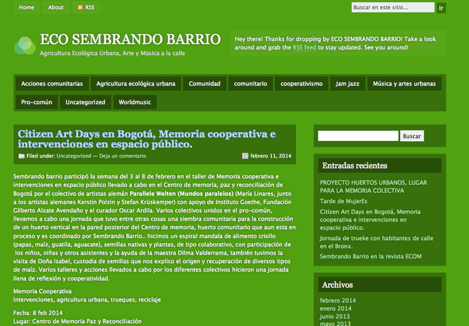 Siehe den gesamten Blogbeitrag als PDF (Spanisch, 1,3 MB) oder im Blog: http://sembrandobarrio.wordpress.com/2014/02/11/citizen-art-days-en-bogota-memoria-cooperativa-e-intervenciones-en-espacio-publico/