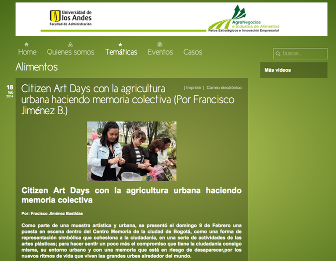 Siehe den gesamten Blogbeitrag als PDF (Spanisch, 280 KB) oder im Blog: http://agronegocios.uniandes.edu.co/index.php/tematicas/alimentos/100-citizen-art-days-con-la-agricultura-urbana-haciendo-memoria-colectiva.