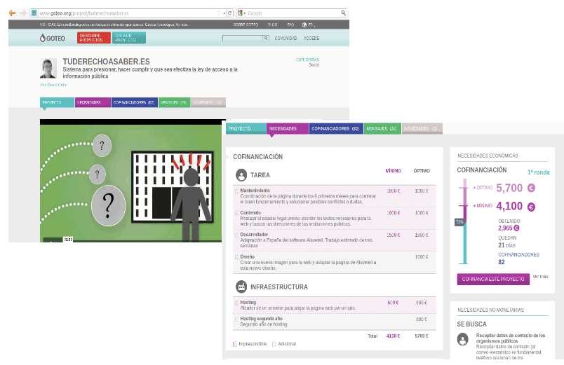Goteo.org wurde im November 2011 von Platoniq.net mit dem Ziel gestartet, einen Schritt in der Entwicklung von crowdfunding weiter zu gehen. Zur gemeinschaftlichen Finanzierung fügte Platoniq.net die Aufgabenverteilung als Möglichkeit für Kollaboration hinzu (Unterstützung bei der Realisierung bestimmter Aufgaben, Material- und Infrastrukturverleih) und konzentriert sich auf die Verdeutlichung der gemeinnützigen Seite kultureller und innovativer Projekte, nämlich ihr Potenzial als Allmendegut, Werkzeuge, Information und Wissen für die Gesellschaft offen bereit zu stellen.